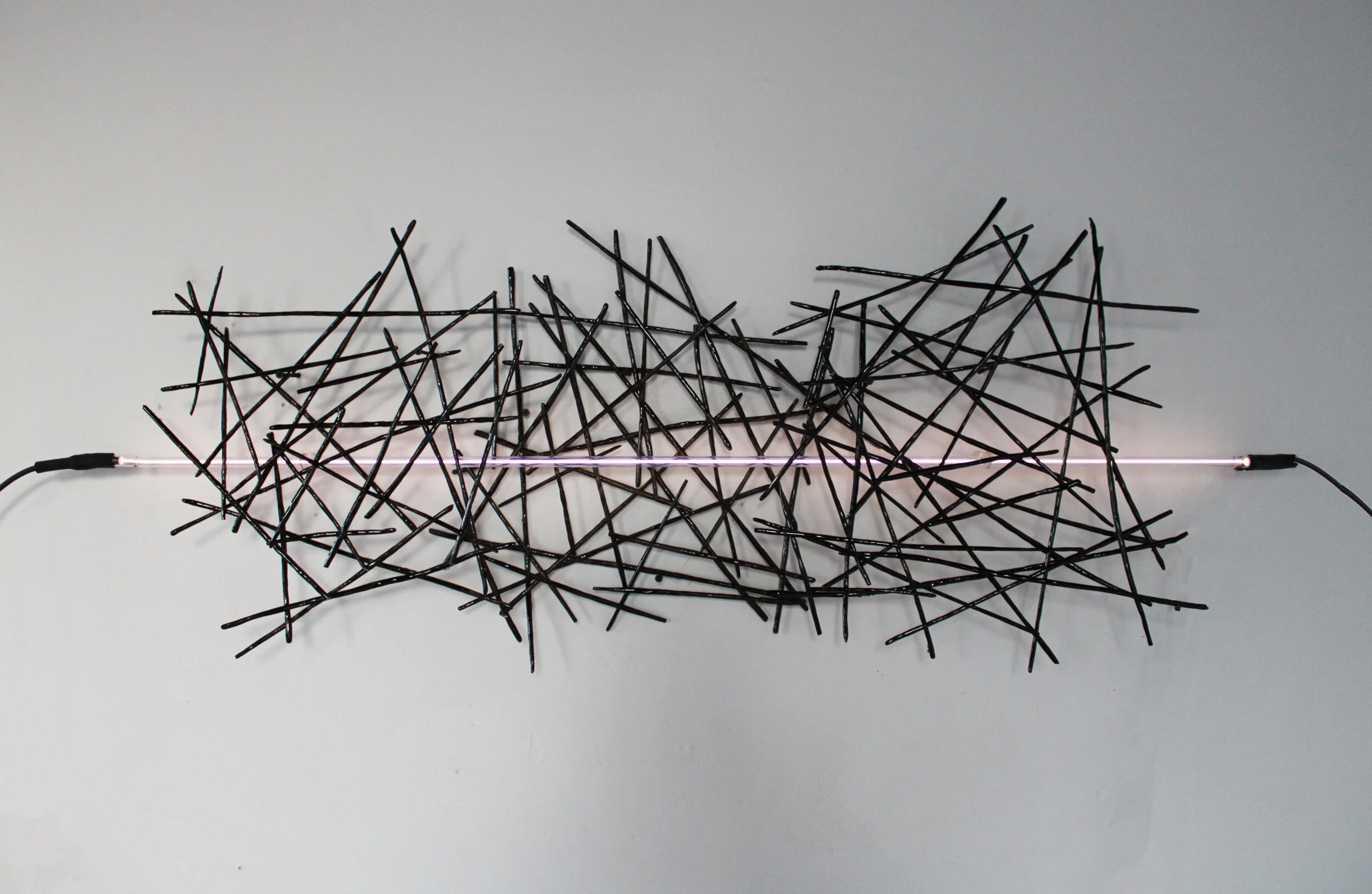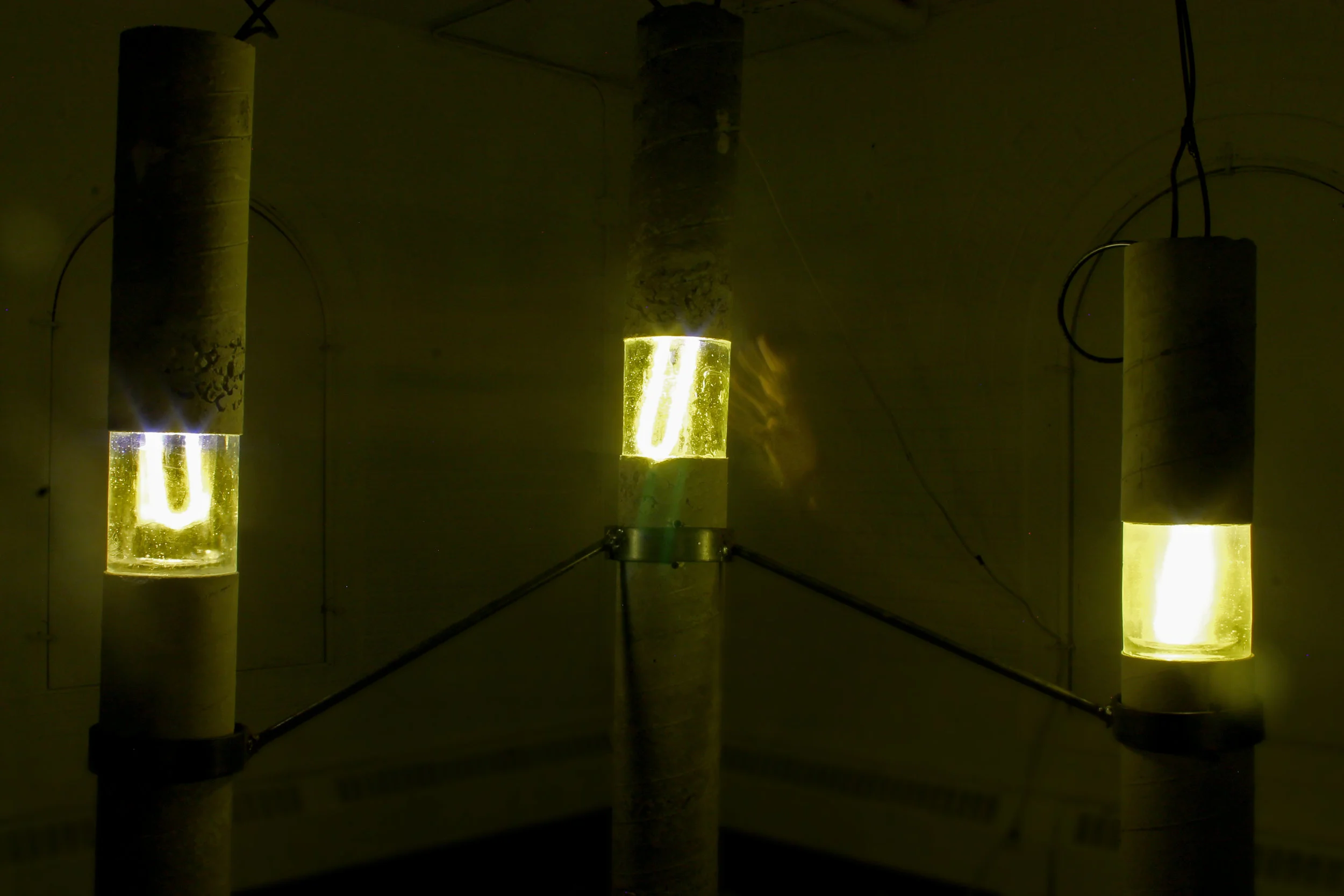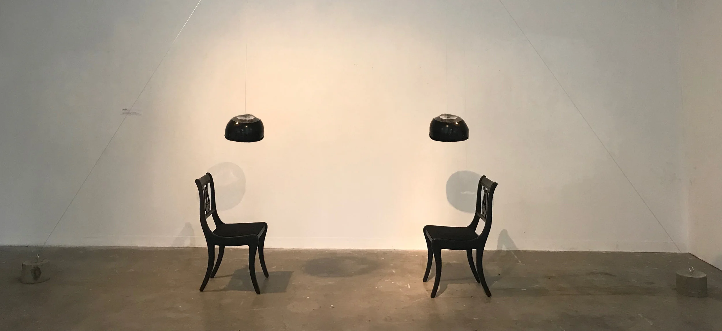 Glass, concrete, steel, paint, polyester, reclaimed furniture